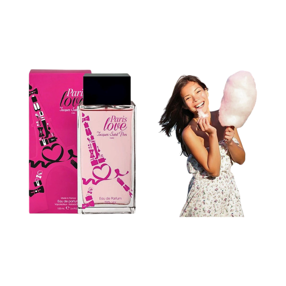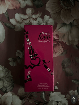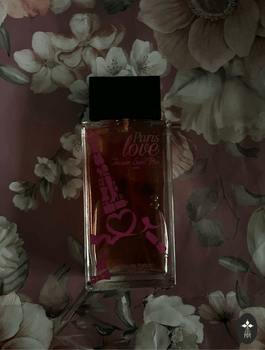 Pink bottle of Jacques Saint Pres Paris Love Eau de Parfum for women. The fragrance is in a 100 ml glass bottle. It features vanilla, raspberry, and sandalwood notes.
