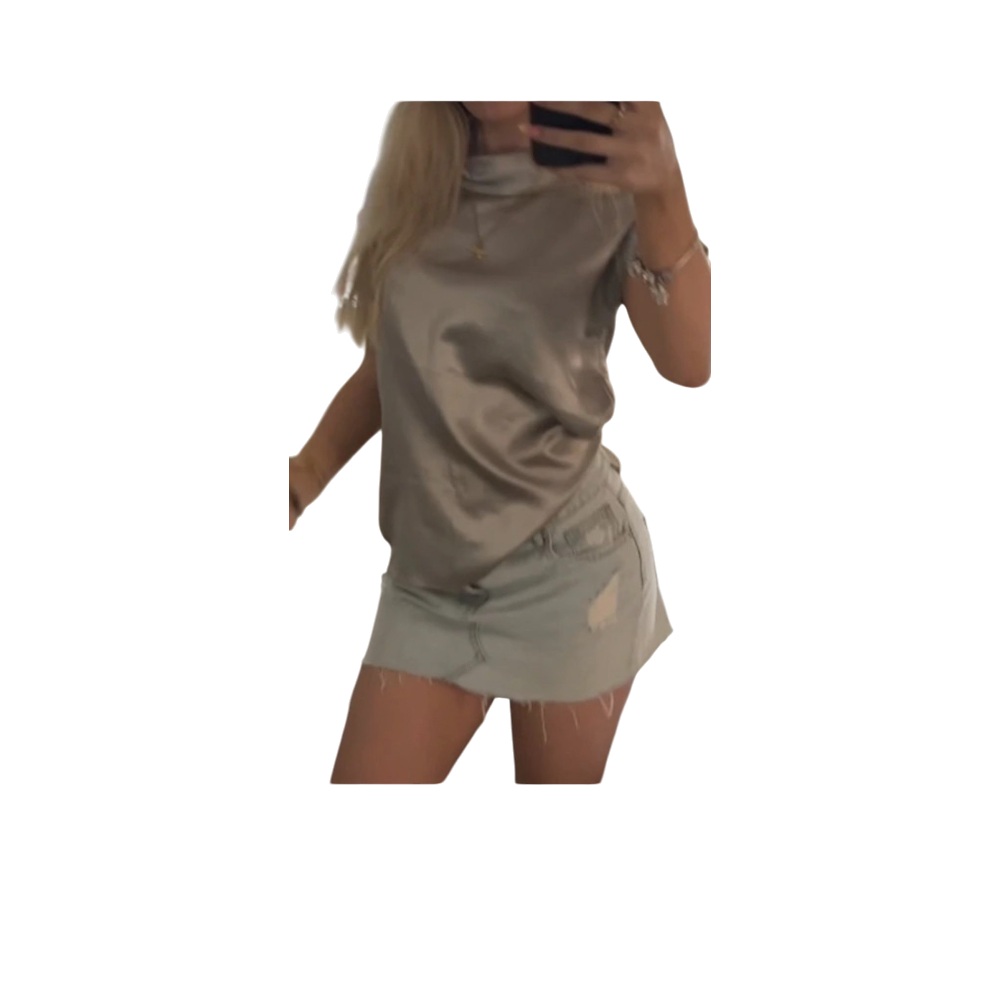 silver satin short-sleeve top with draped neckline, relaxed fit.