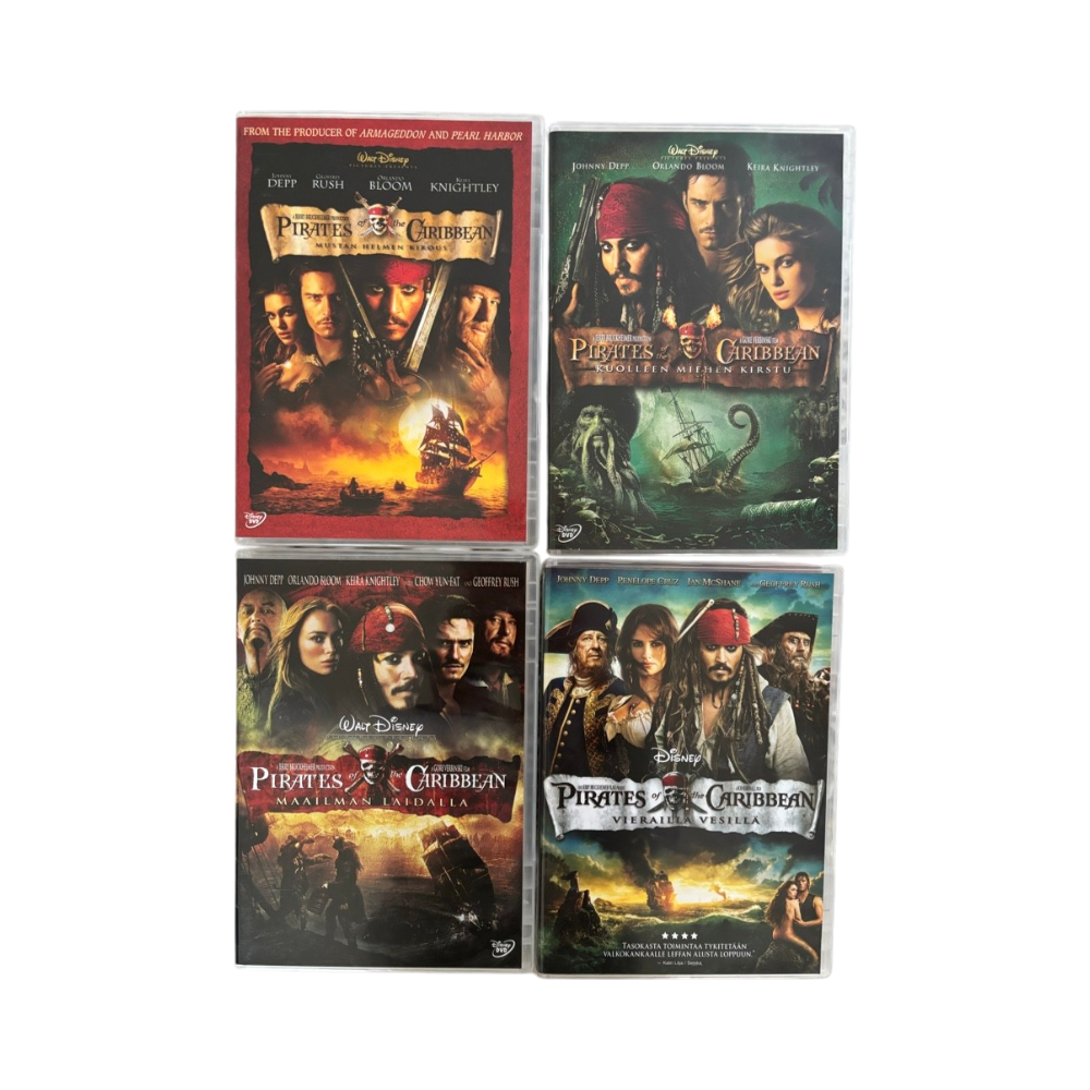 Pirates of the Caribbean -elokuvat 1–4 samassa paketissa! Kaikki DVD-levyt ehjiä ja testattu toimiviksi. Suomi-tekstit. Täydellinen valinta leffailtaan, nostalginen seikkailuklassikko täynnä huumoria, toimintaa ja Johnny Deppin ikoninen roolisuoritus Kapteeni Jack Sparrow’na.