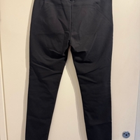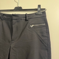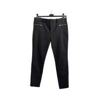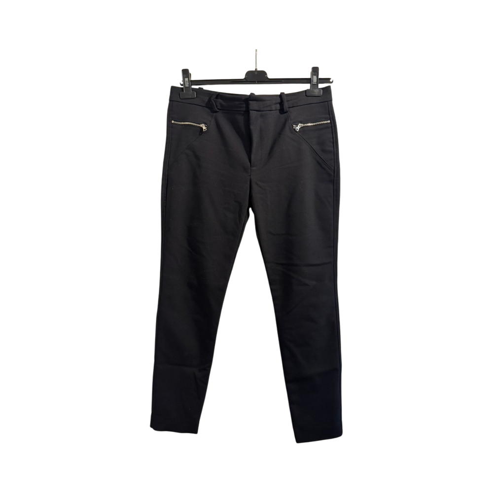 Mustat suorat housut. Matalavyötäröiset. Vetoketjut edessä.