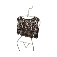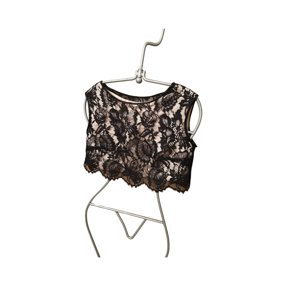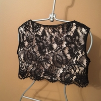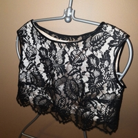 Hihaton croptop-mallinen lyhyt pitsitoppi, alla roosanvärinen satiinikangas. Croptop-mallinen. Ei kokolappua, Kainalo-kainalo 45 cm, pituus 33 cm. Arvioitu koko M.