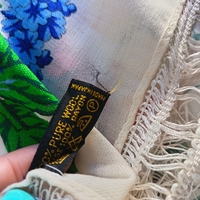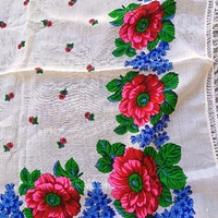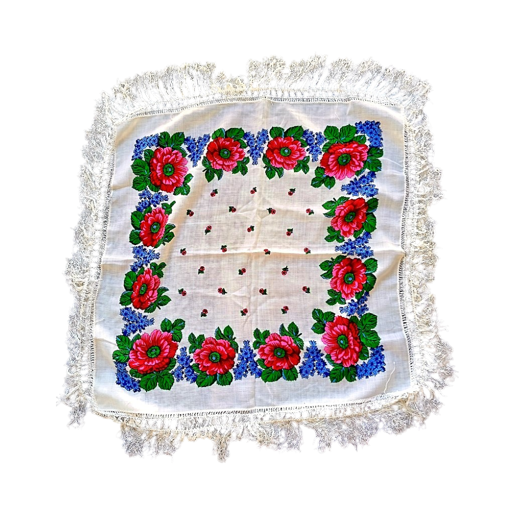 Villahuivi, jossa punaiset ja siniset kukat, hapsureunat.70cmx70cm.Käyttämätön ja made in Japan.