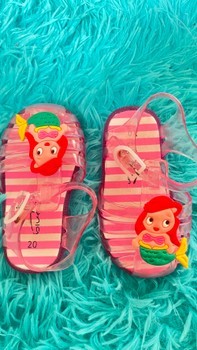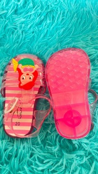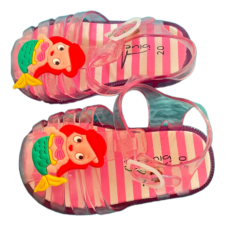 Kids jelly sandals with a mermaid detail. Transparent pink color with striped insole and adjustable ankle strap. Size 20.