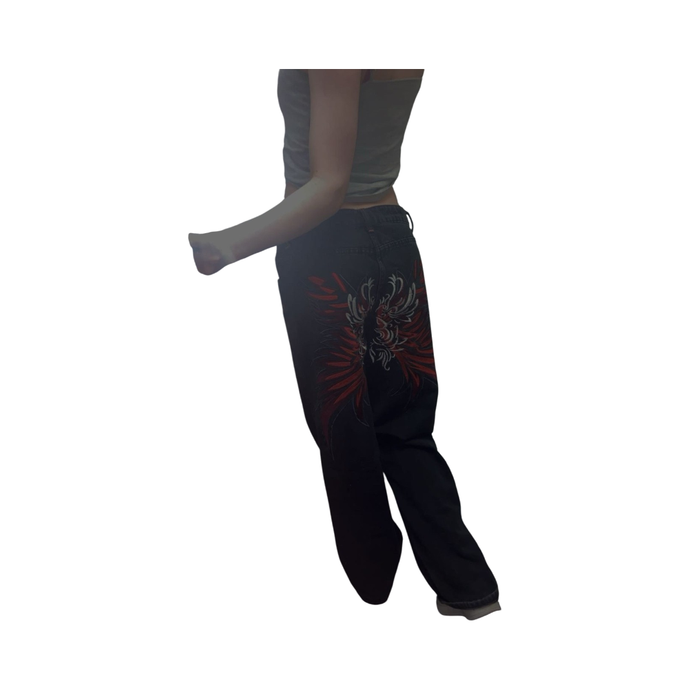 Musta baggy-farkku suurilla punaisilla kirjailuilla takana.