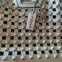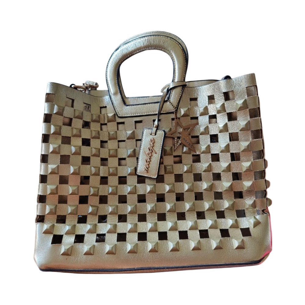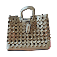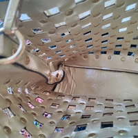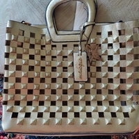 Kullanvärinen laukku, liimaukset osin auenneet ja kahvan pinta on murtunut. Näistä kuvat. Leveys 36 cm ja korkeus noin 28 cm, pohjan leveys noin 10 cm. Laukkuun kuuluu sisäpussi, jossa vetoketju. Pinta on murtunut, sen saa mukaan kaavaa varten, jos haluaa tehdä uuden sisäpussin. Kaksi viimeistä kuvaa. Materiaali todennäköisesti keinonahka/ muovi