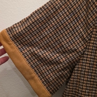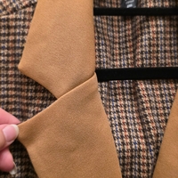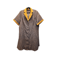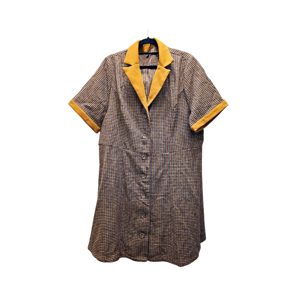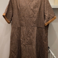 Ruskea ruudullinen mekko, napitettu edestä, lyhyet hihat. Ihanan pehmeää, mutta jämäkkää kangasta. 😊