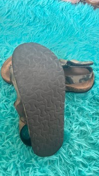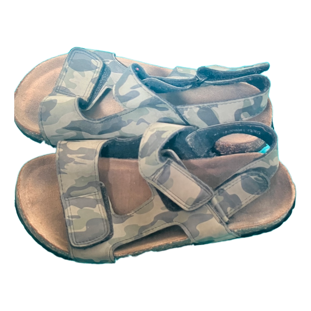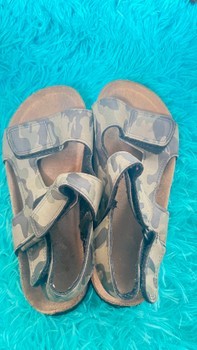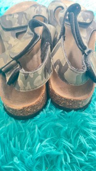Sandals with camouflage print and velcro straps. Cork-style sole, size 34.