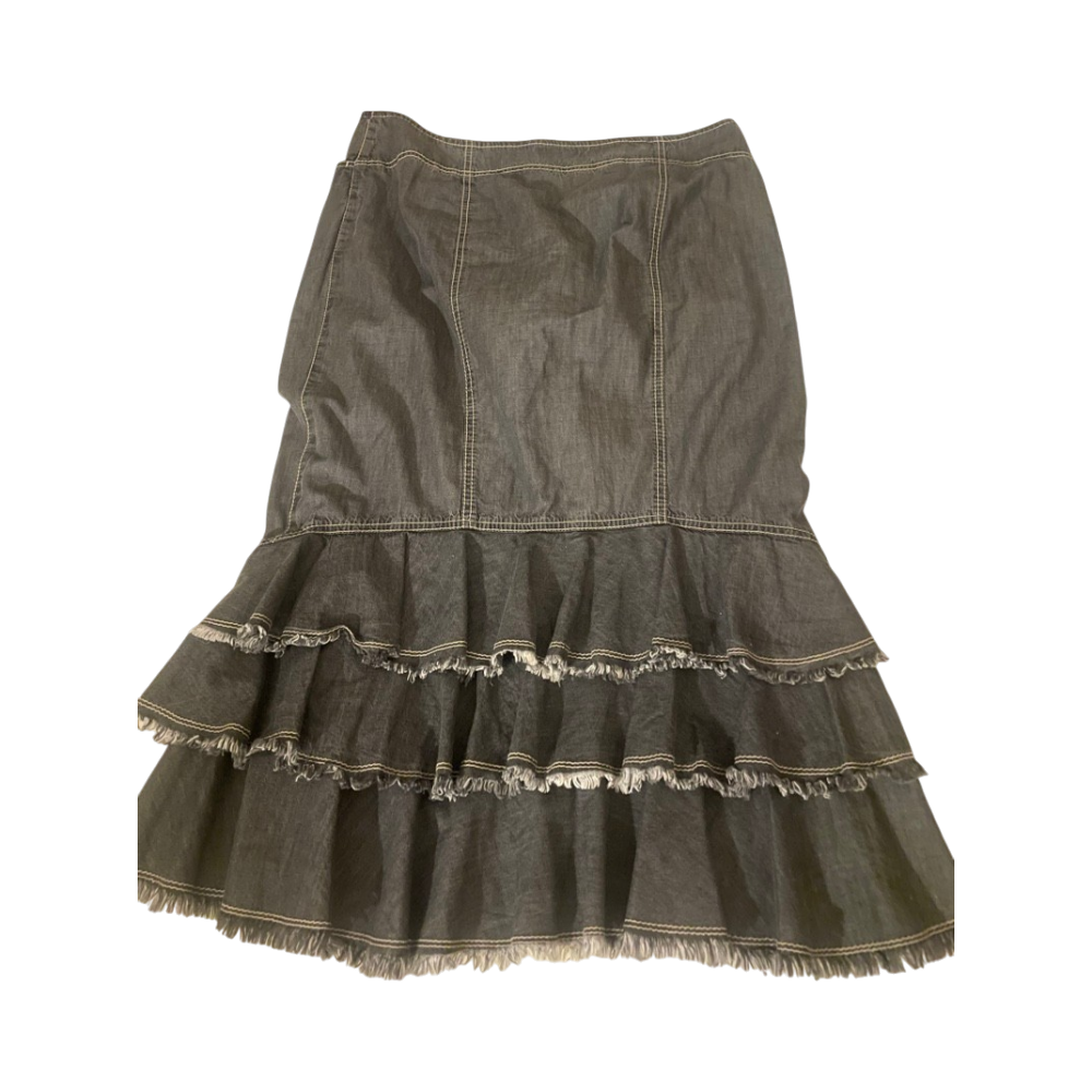 Grey denim skirt with tiered ruffle hem and frayed edges.