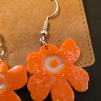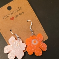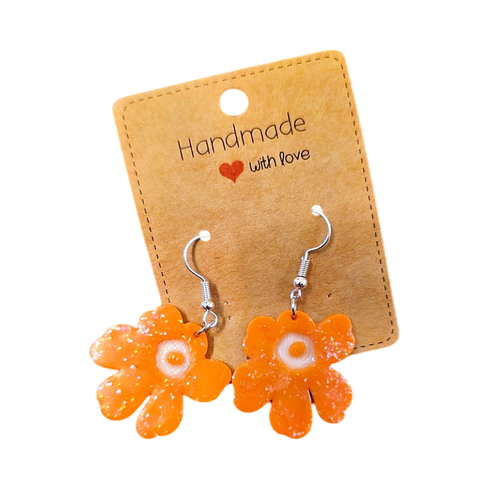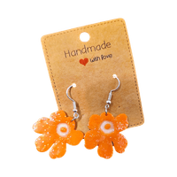 Käsintehdyt oranssit kukka-aiheiset korvakorut. Käsityönä tehdyt. Jonkinlaista muovia. Koukku ei ole hopeaa.