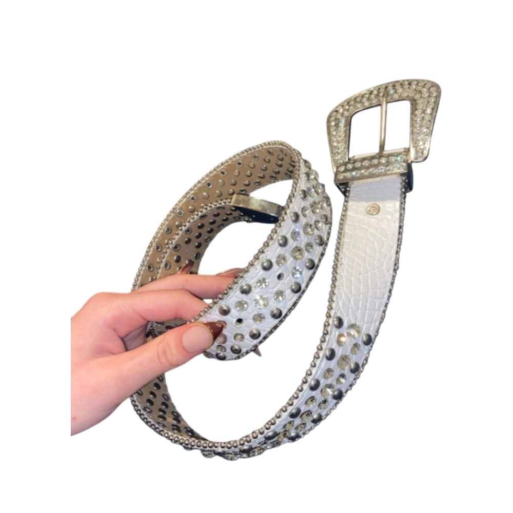 Valkoinen vyö hopeisilla niiteillä ja strassikoristeilla.