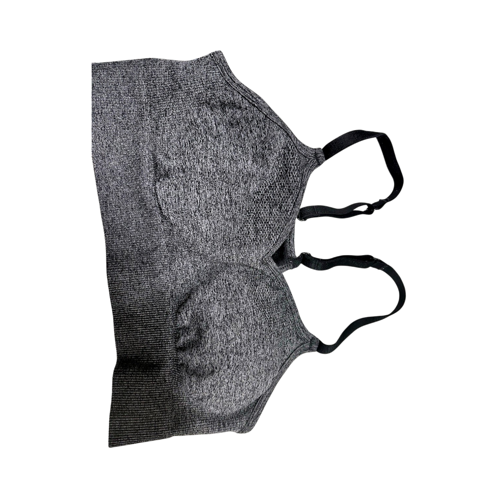 Harmaa harjoitusliivi, jossa leveät olkaimet ja pehmustetut kupit. Sopii aktiiviseen käyttöön.