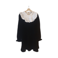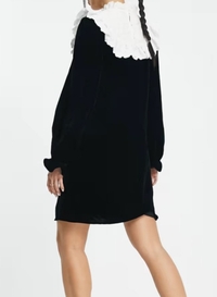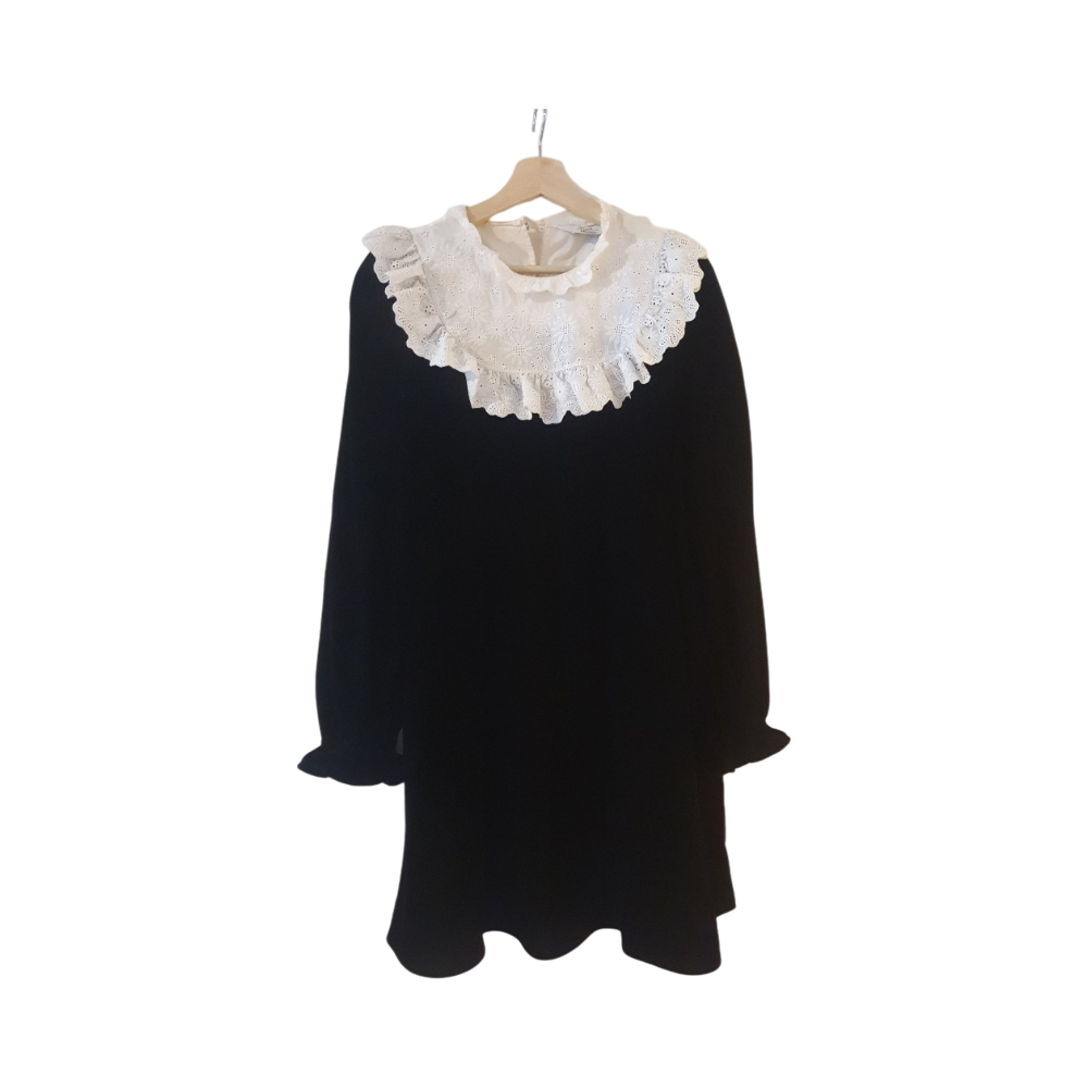 Tyylikäs musta mekko, jossa valkoinen kaulus.
