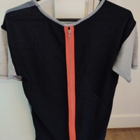 Lyhythihainen paita harmaalla ja mustalla kuviolla vetoketjukoriste takana.