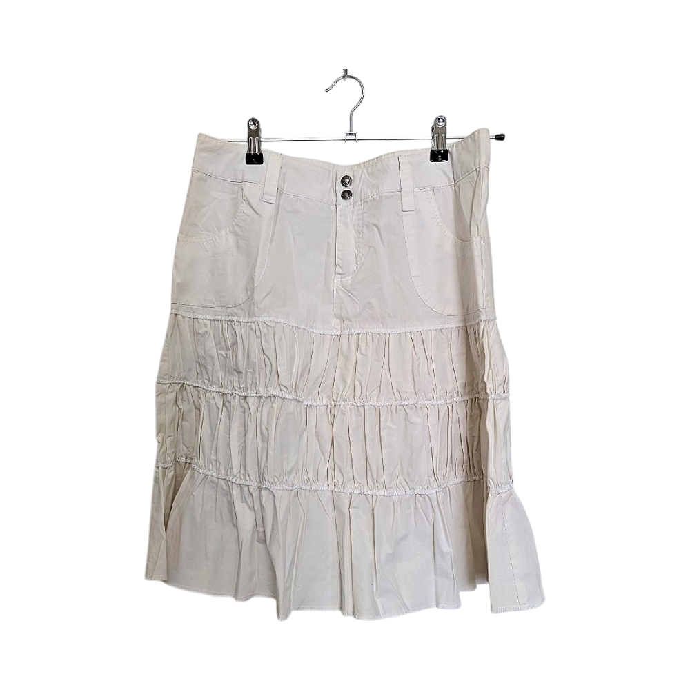 Valkoinen kerroksellinen hame, taskuilla ja vyölenkeillä. Reilua kokoa S.
