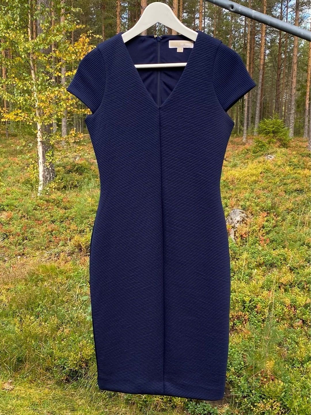 Ihonmyötäinen Michael Korsin kotelomekko värissä "true navy". Kangas on tukevaa, mutta hieman venyvää. Käytetty kerran juhlissa, ja on siistissä kunnossa. Takana on piilovetoketju ja helman takaosassa on pieni halkio. Koko S. Ovh 180 €.