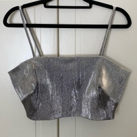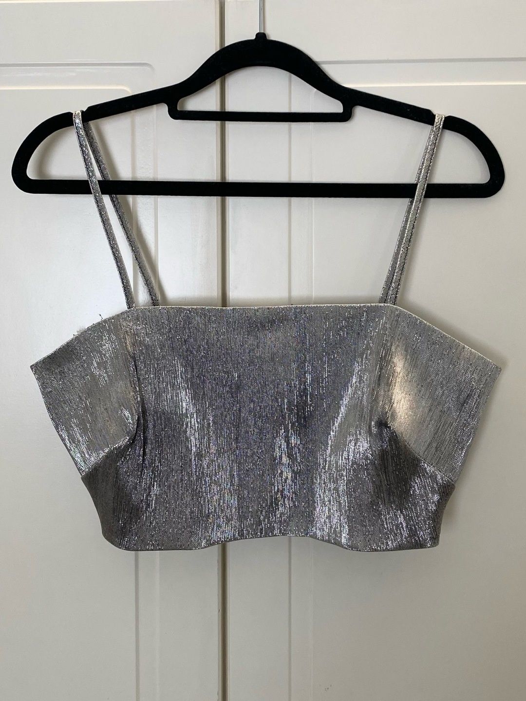 Uusi ja käyttämätön lyhyt hopea kimaltava toppi, koko 42, mutta on pientä kokoa, joten sopii noin M-kokoiselle.