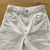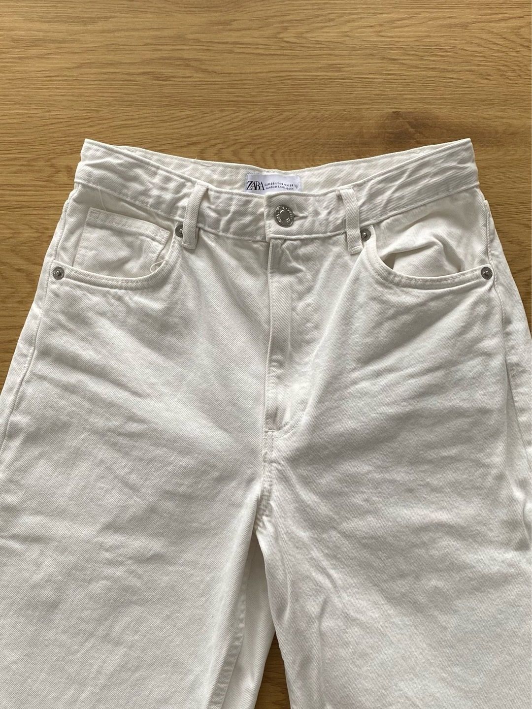 Muutaman kerran käytössä olleet suora/leveälahkeiset Zaran farkut, joissa revityt lahkeet. Koko 38.