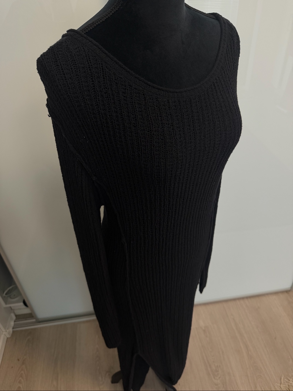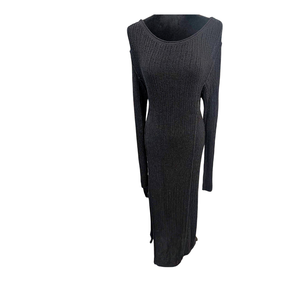 Long-sleeved maxi dress in black. Features a ribbed knit texture and a round neckline.