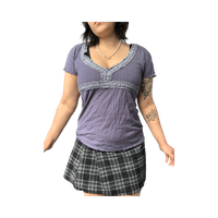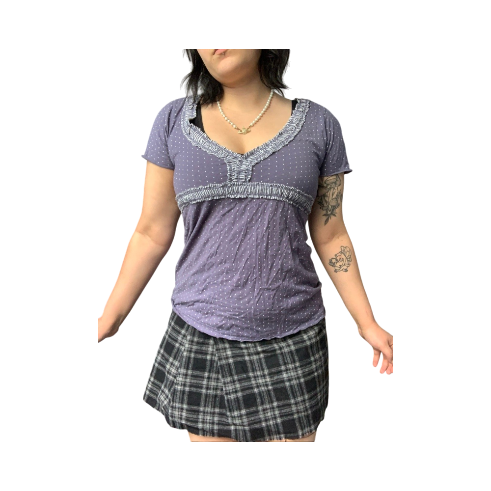 Short-sleeve blue polka dot v-neck top with ruffle trim.