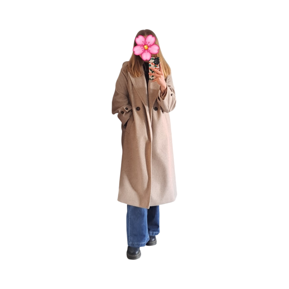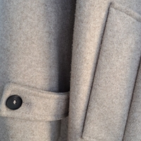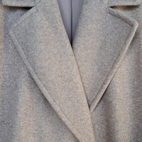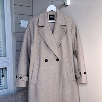 Beigenharmaa villakangastakki, kiva oversized malli. Olkasaumasta olkasaumaan 51cm, hiha olkasaumasta 57cm, pituus olkasaumasta 108cm. Pinta joistain kohdista vähän nyppyyntynyt (lähinnä kainaloista, katso kuva lopussa.