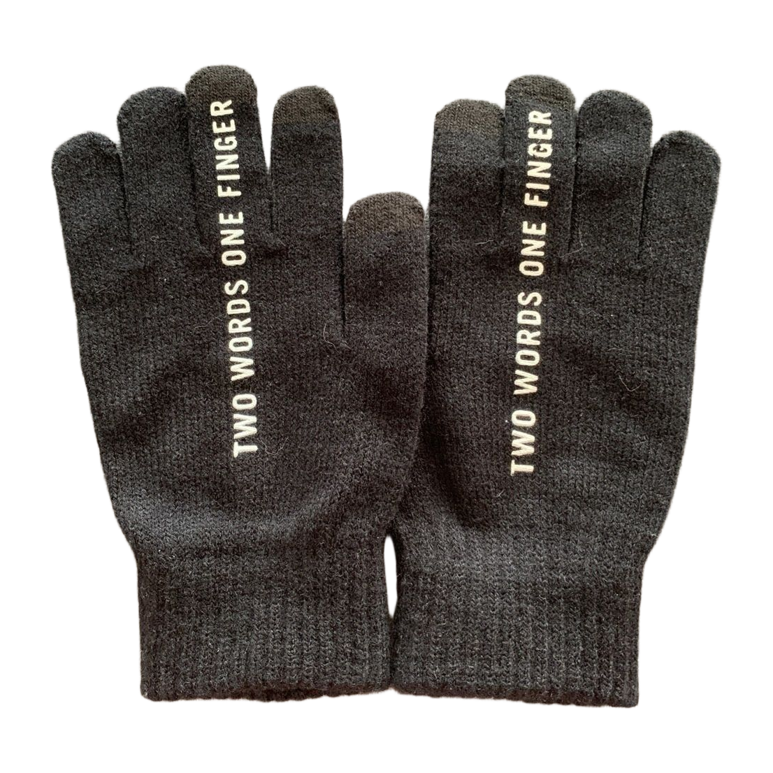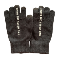 Musta hanskat tekstillä ”Two words, one finger”.