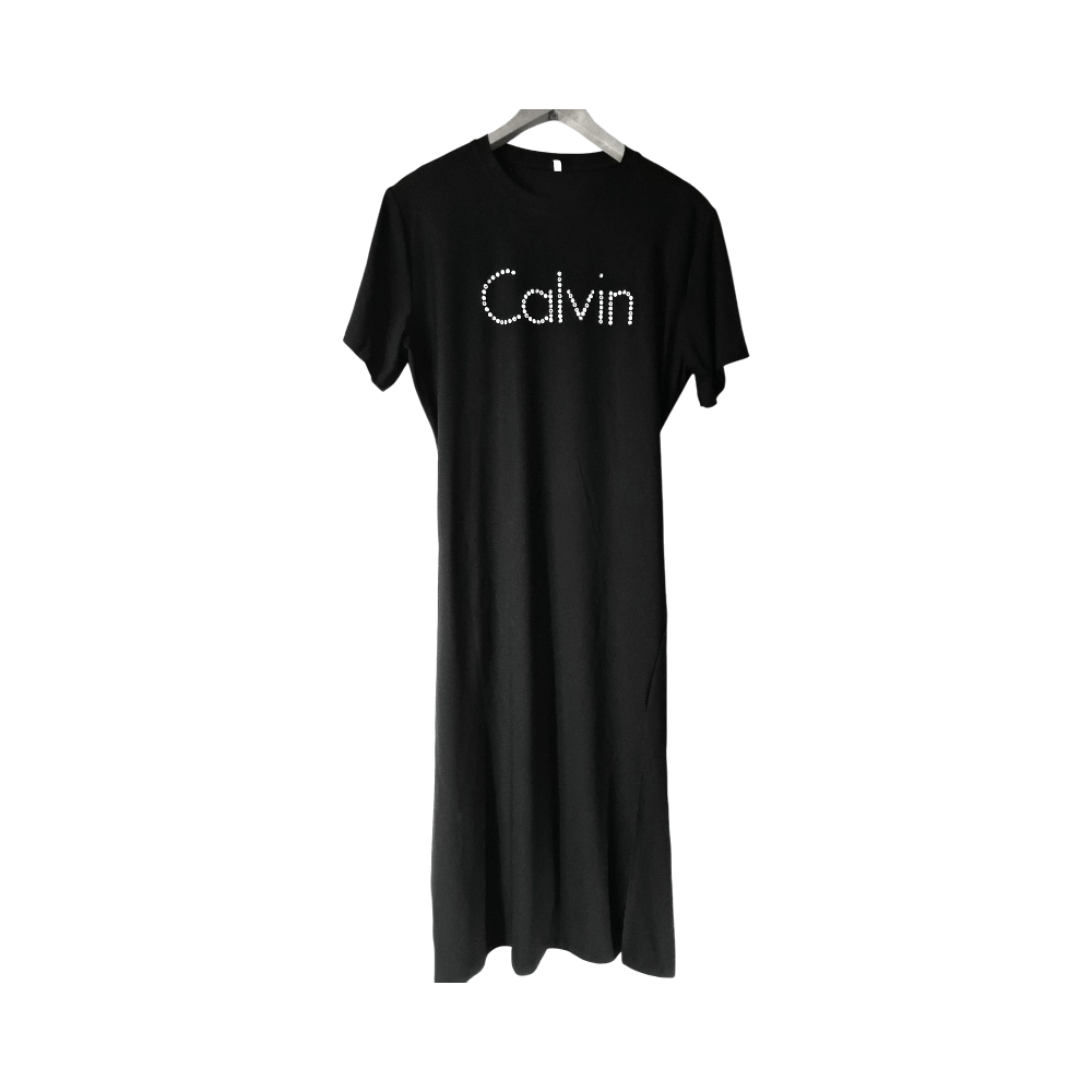 Pitkä musta mekko, koristeteksti edessä.Taskut,halkio sivulla