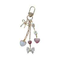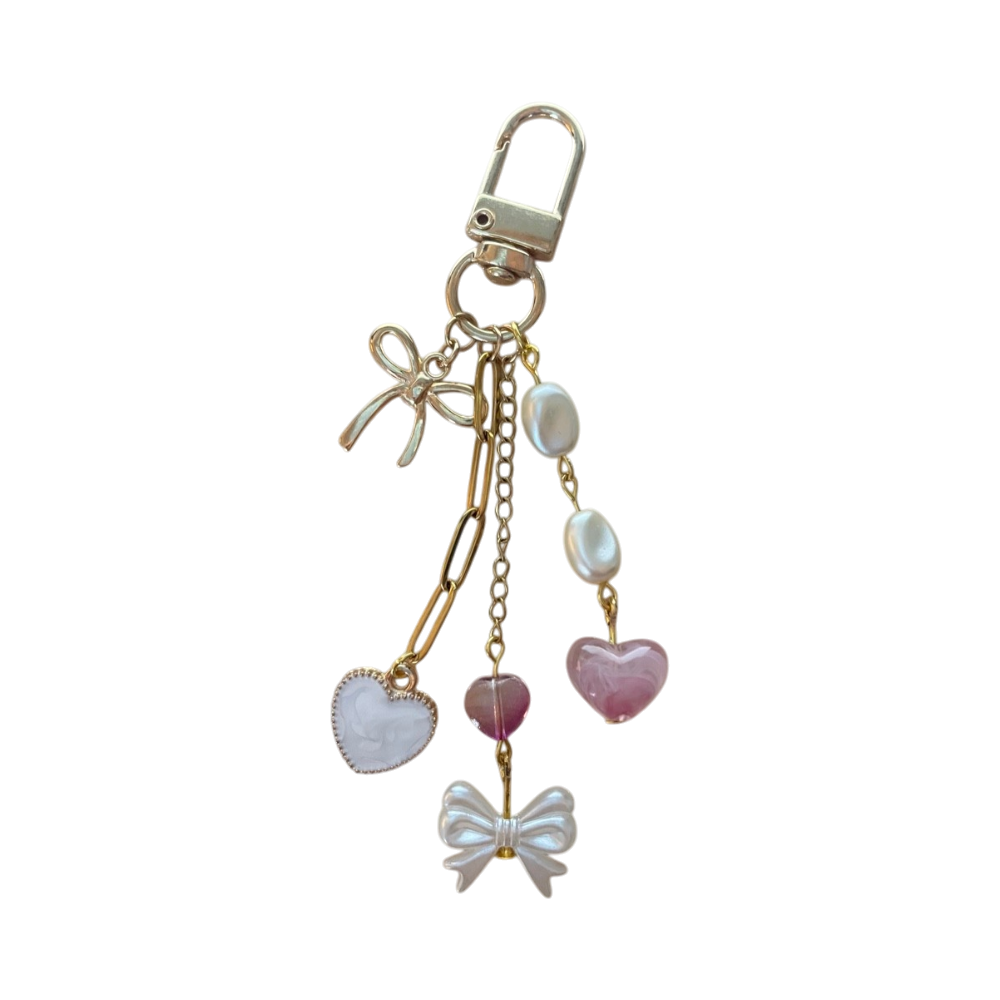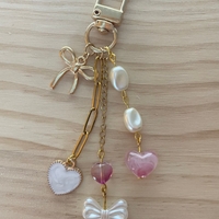 Käsintehty kullanvärinen laukkukoru sydänhelmillä ja rusettiriipuksilla💗