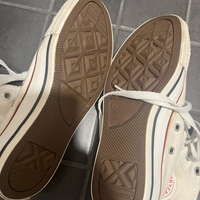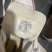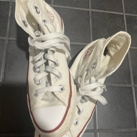 Classic white Converse high top sneakers, worn a few times, good condition, but need to be cleaned. Logo is a bit off and on the back (see pics), otherwise totally good.