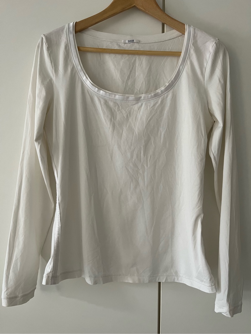 Wolfordin valkoinen pitkähihainen koossa M. Tosi pehmeä ja miellyttävä kangas. Kauluksessa ja kyljissä satiiniset kanttaukset. Valmistettu Itävallassa