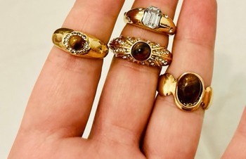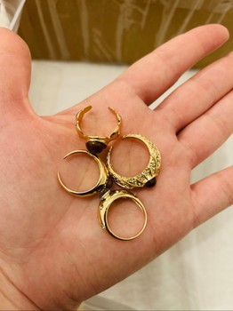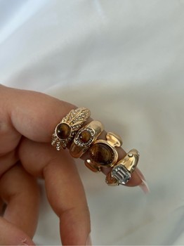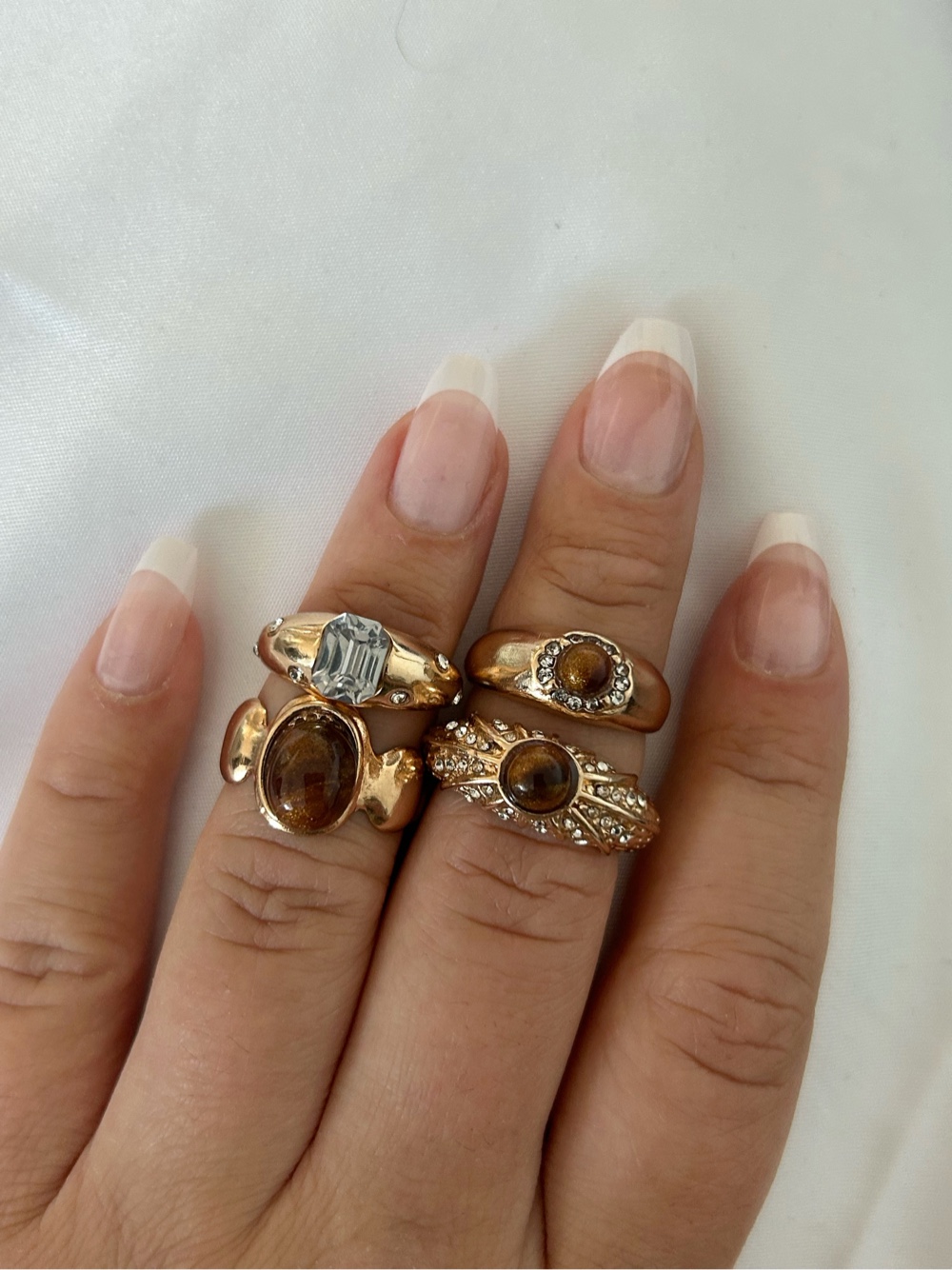 Set of four gold-tone rings featuring various gemstone and crystal accents. Some rings have open, adjustable designs.
