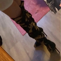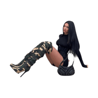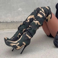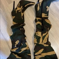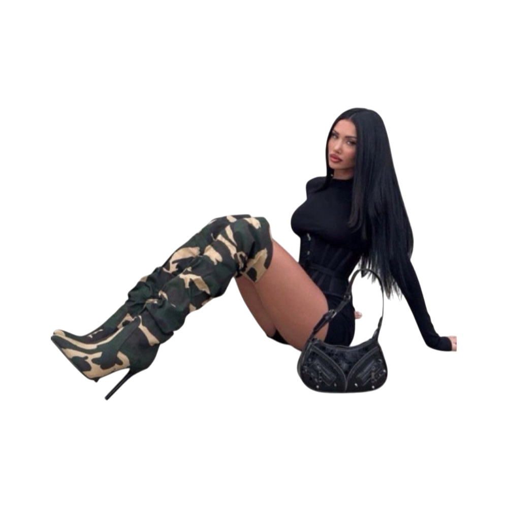 Korkea, camo-kuvioitu ylipolvensaapas, teräväkärkinen korko. Ei kertaakan ole käytetty