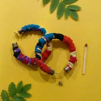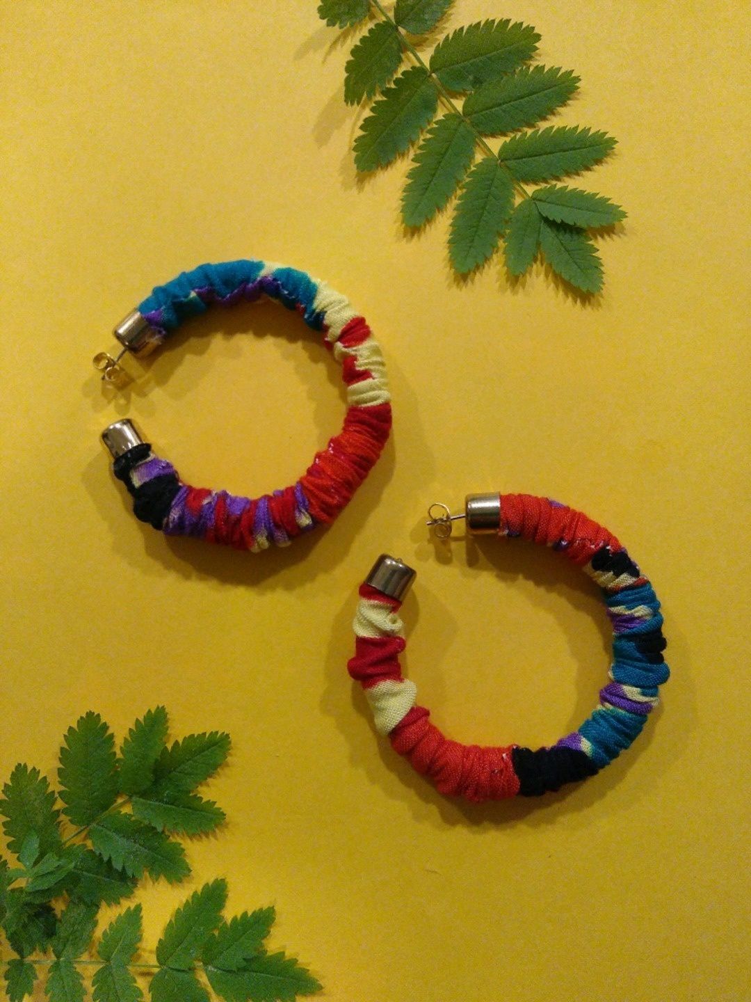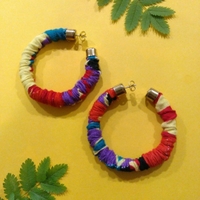 Kangaspäällysteiset vintage-korvarenkaat joissa punaisen, sinisen ja keltaisen sävyjä, tappikiinnitys. Halkaisija n. 5,5 cm.
