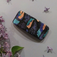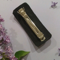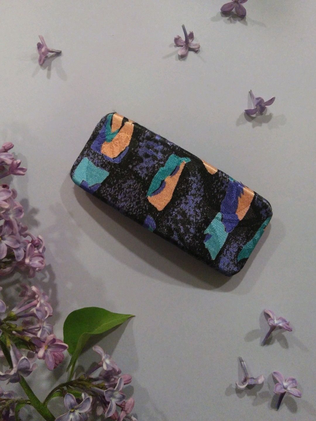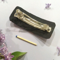 Kiiltävällä kankaalla päällystetty sinisen ja vaaleanpunaisen sävyinen vintage-hiussolki, pituus n. 9 cm.