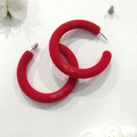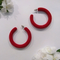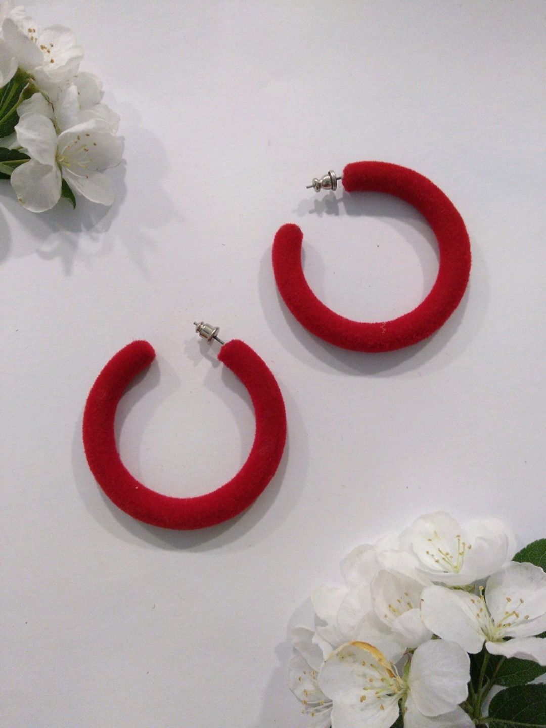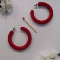 Punaiset, samettipintaiset vintage-korvarenkaat, tappikiinnitys. Toiselta puolelta samettipinta hiukan kulunut, näkyy kuvassa.