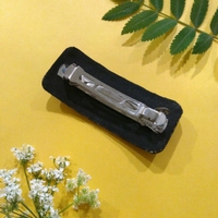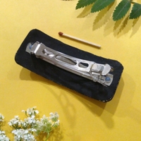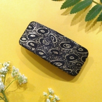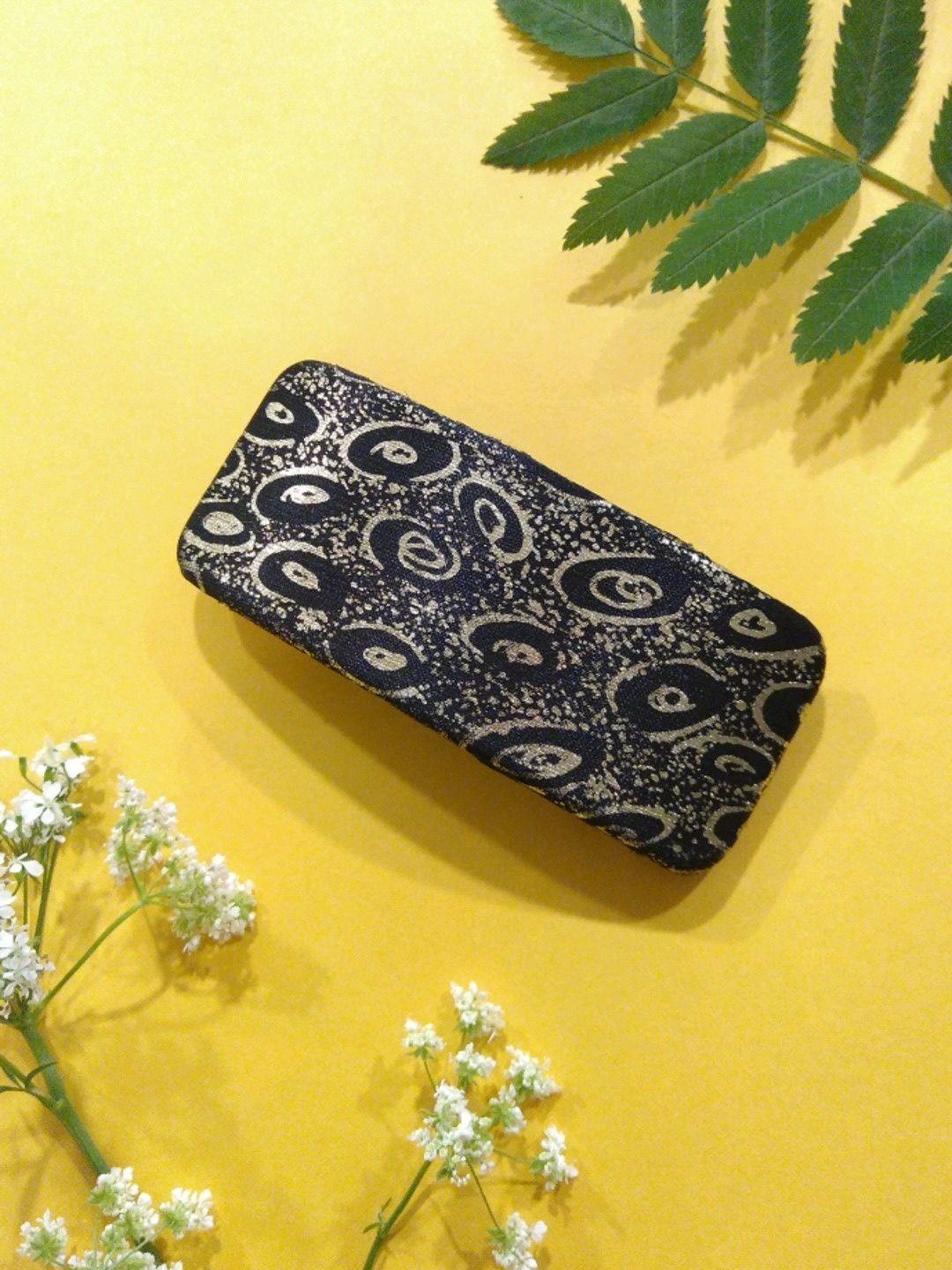 Vintage-hiussolki päällystettynä mustalla kankaalla, jossa kultakoristeinen eläinkuosi. Uusi, ei ollut käytössä.