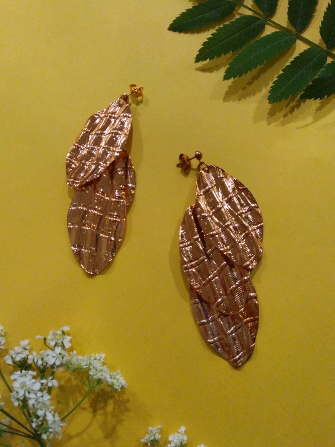 Upeat, roikkuvat ruusukullan/pronssinhohtoiset metalliset vintage-korvikset. Tappikiinnitys.