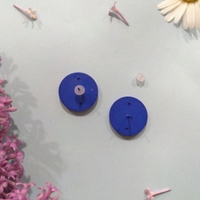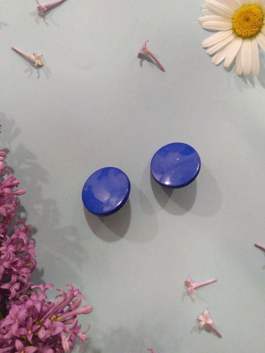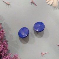 Pyöreät siniset vintage-nappikorvakorut, tappikiinnitys. Huom! Tappi on muovia, joten se on hiukan paksumpi kuin metalliset tapit yleensä.
