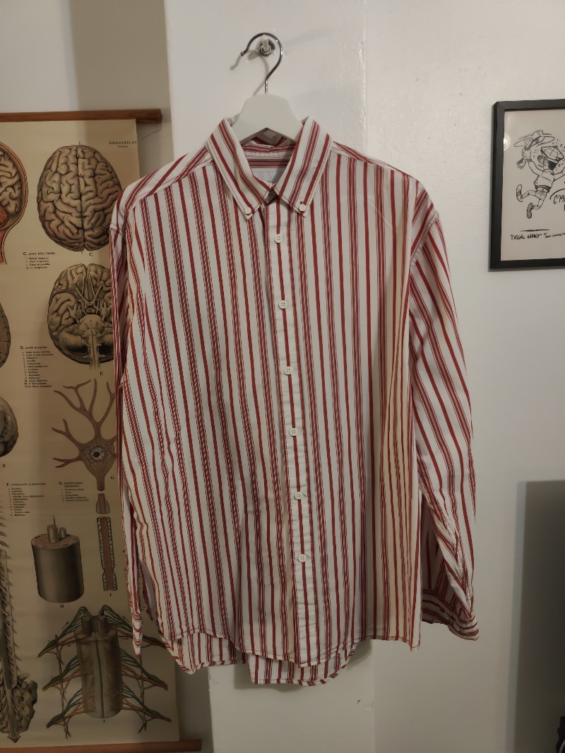 Valkoinen punaraitainen pitkähihainen nappipaita. Kaksi kertaa käytetty.