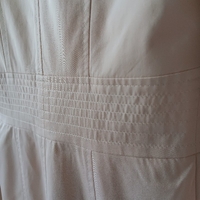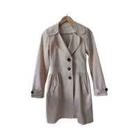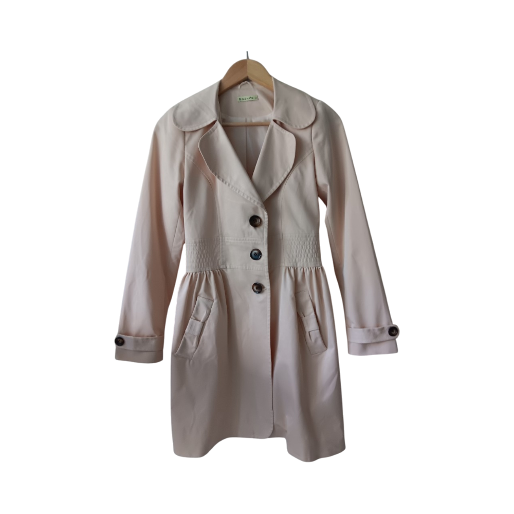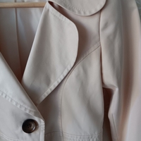 Vaaleabeige midimittainen trenssi, napit ja koristetikkaukset vyötäröllä. Tilavat taskut. Kaunis leikkaus. Koko on pieni 38 (kapealle). Suosittelen 36:lle.