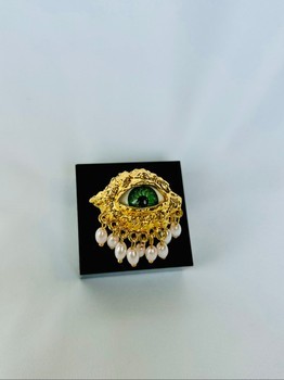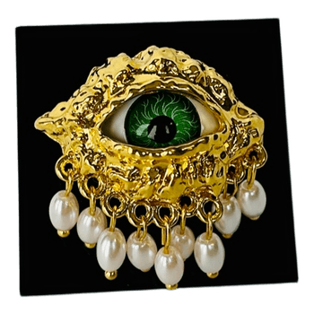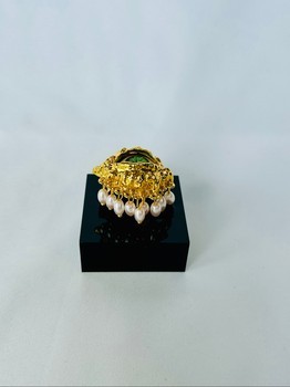 Gold-tone statement ring featuring a green eye design with dangling pearl accents.