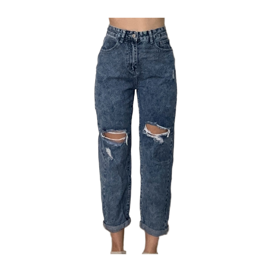 Blue mom jeans with washed denim look and ripped knees. High-waisted with a relaxed straight fit – easy to style for casual everyday wear. Size S / EU 36. In good condition, no stains or other wear – the rips are part of the design.