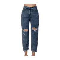 Siniset mom jeans -malliset farkut, joissa kulutuspesty pinta ja polvissa tyylikkäät repeämät. Korkeavyötäröinen, rennon suora malli – helppo yhdistää arkeen ja vapaa-aikaan. Koko S / 36. Hyvässä kunnossa, ei tahroja tai muuta kulumaa – reiät ovat osa designia.