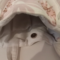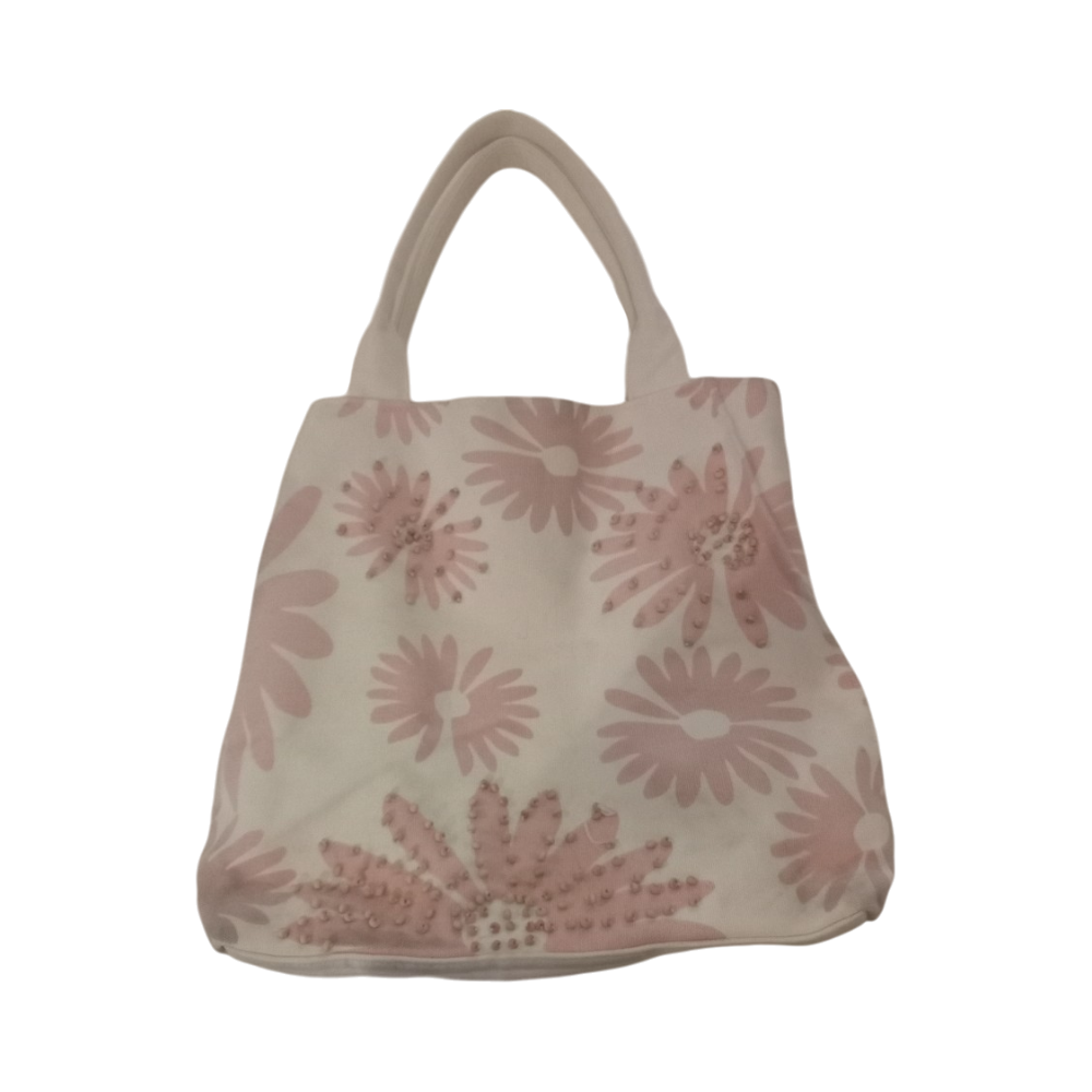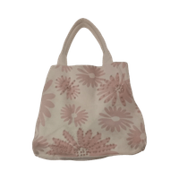 Kangaslaukku, vaaleanpunaiset kukat ja helmikoristelut.
