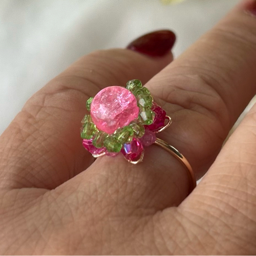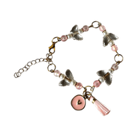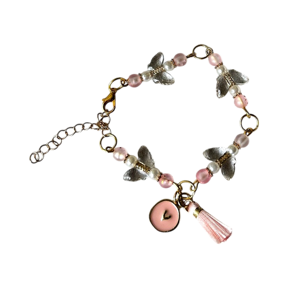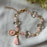 Koristeellinen rannekoru vaaleanpunaisilla helmillä ja perhosilla