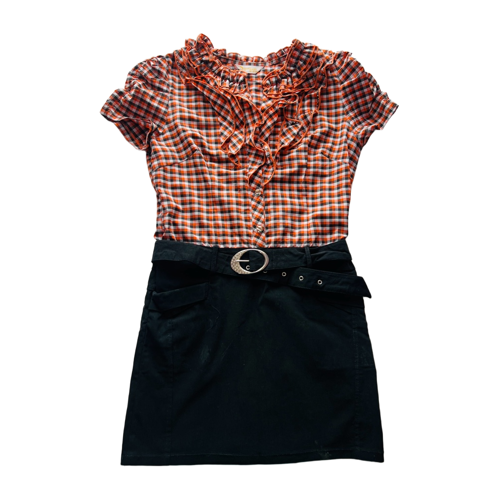Oranssi-ruudullinen paitamekko mustalla vyöhelmalla