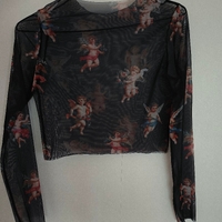 Läpikuultava, musta pitkähihainen pusero, jossa enkelin kuvia.