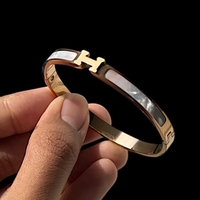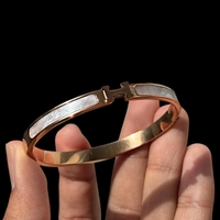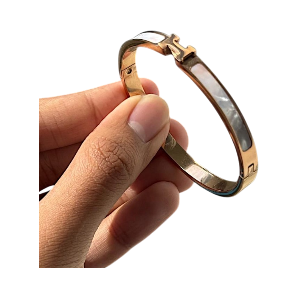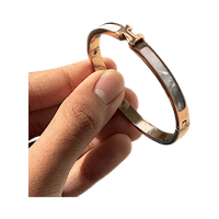 Rose gold-tone hinged bangle with white inlay, minimalist elegant design.
