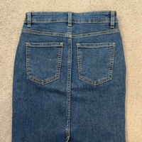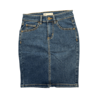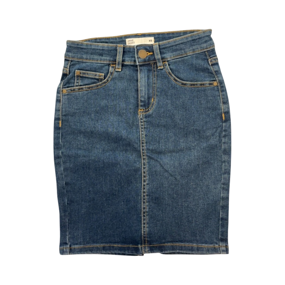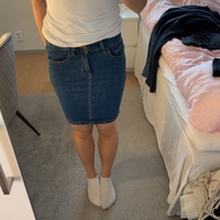 Sininen denimihame, suoramallinen, polvipituus.