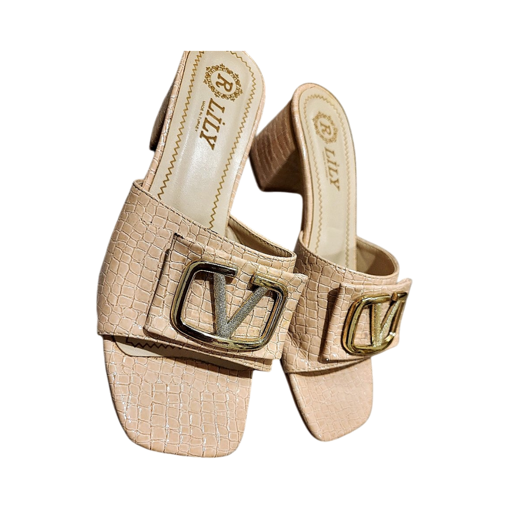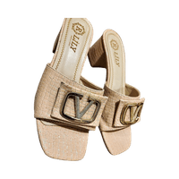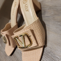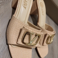 Beiget korkokengät kultaisella V-soljella, koko 37. Pieni kuluma soljessa. Sopii 37-38 jalkaan.