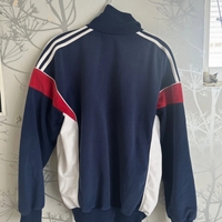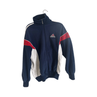 Vintage-style navy track jacket with white and red panels.